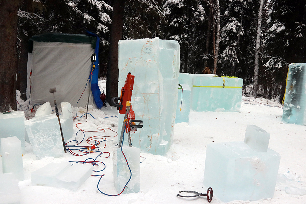 When the horn blew at 8:00AM this morning, February 15, 2021, the 2021 World Ice Carving Championships officially began. The gate opened at noon for visitors wishing to watch the carvers begin their work for the multi-block competition at this year’s event. The woods have come alive, perhaps not with the sound of multiple chain saws just yet, but with the beep beep beep of the forklifts, called Zoom Booms, as they maneuver the blocks of ice into position, following instructions from the teams of sculptors. If you look closely at the blocks, some of them have papers ironed to them with the outlines of the designs on them. The multi-block teams have five days to go from multiple blocks scattered around to an impressive piece of art. “A little progress everyday adds up to big results.”