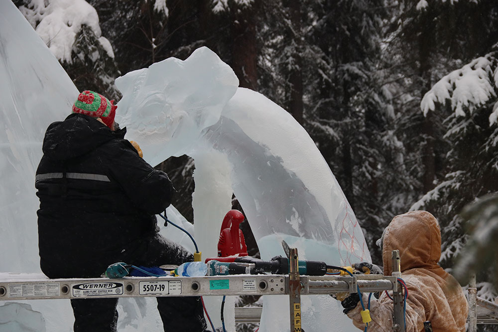 With about thirty hours left until the horn blows at 9PM Saturday night, the multi-block carvers are in the home stretch, the final part of their competition. There is almost a feeling of calm as you walk through the Enchanted Forest. Sculptors are busy fine tuning and working on the intricate details that give their carvings the breathtaking wow factor you expect. Now by tomorrow the atmosphere may revert back to frenzy for the ultimate home stretch. Just for fun, I heard that one team fixes all their meals right on site so if they want to, they can work 24/7.