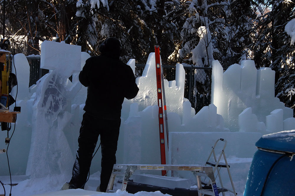 Six hours until the end of the 2021 World Ice Carving Championships Multi-Block. A horn blows signaling the competition is over. The carvers drop all their tools and their sites must be clean. They then leave and the team of judges come in. A team may be disqualified for staying or reentering their competition site after the ending horn has sounded and before the judging process has been completed.